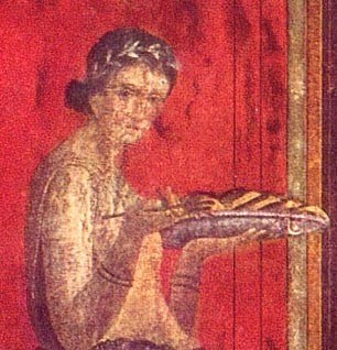 Cette jeune esclave portant un gâteau prend une signification différente selon qu'on l'isole, comme le fait Paul Veyne, ou qu'on la rattache à la scène suivante comme le fait Gilles Sauron. Pour celui-ci, elle porte un plateau d'offrandes aux "prêtresses" qui officient dans la scène suivante ; pour celui-là, elle incarne les festivités matrimoniales : tournée vers des invités invisibles, dont le spectateur occupe la place, elle leur apporte un gâteau de sésame coupé en tranches. Car le contenu du plateau ne fait aucun doute pour Paul Veyne qui remarque que "découper le sésame" c'était alors tout simplement se marier: " je voudrais que ce soit déjà la noce... lit-on dans une comédie contemporaine de la fresque ; je voudrais offrir un sacrifice, me couronner et trancher le sésame". Si le sésame symbolise le mariage, c'est qu'il est "polygonôtatos", nous dit Ménandre, ses "nombreux rejetons" sont un gage de fécondité pour le nouveau couple.