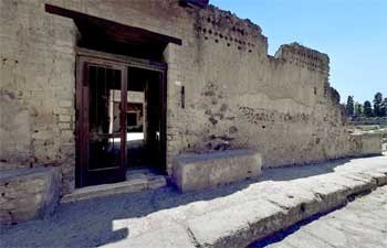 (H) Maison à cloisons - Opus graticium - {Insula III, n. 13, 14, 15). - A côté des diverses maisons de type samnite à caractère patricien, Herculanum nous donne, dans cette humble construction, un exemple admirablement conservé de maison de type populaire et économique, construite selon une technique et avec des matériaux plus pauvres que dans la construction commune en maçonnerie, c'est-à-dire en opus craticium. Les parois ont une armature de bois ou même de roseaux disposés en treillis. Vitruve explique l'adoption de cette technique par la rapidité d'exécution qui en résultait et le peu de consistance du terrain sur lequel il fallait bâtir. Mais il signale aussi les graves inconvénients qu'offraient ces maisons d'être facilement la proie des incendies et de s'imprégner de l'humidité du sous-sol.