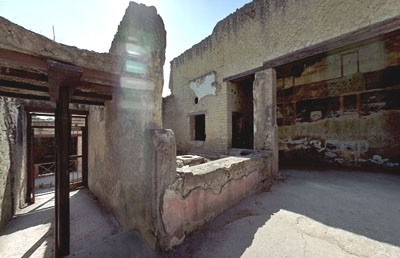 Maison du Bicentenaire (Insula V, n. 15 et 16). - Ains appelée parce que l'on a achevé de la désensevelir en 1938, année de la commémoration du deuxième centenaire des premières fouilles d'Herculanum (1738). Située en bordure du " decumanus maximus ", au milieu de boutiques et d'humbles habitations, c'est la plus noble et la plus somptueuse maison de l'insula V. Cependant, elle a subi les mêmes humbles transformations que l'on a remarquées dans les autres édifices privés. Le rez-de-chaussée a conservé intégralement le plan qu'il était de tradition d'adopter pour les maisons patriciennes.