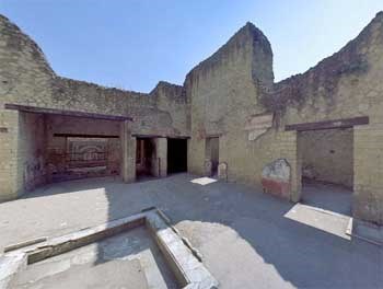 Du couloir d'entrée, précédé du vestibule, on passe dans le vaste atrium carré, avec le toit à compluvium, dont les poutres maîtresses ont été remises à leur emplacement d'origine, avec l'agréable pavement de mosaïque à simple fond noir et à cubes blancs, avec l'impluvium de marbre bordé d'une bande de mosaïque à tresse, et les murs revêtus de beau rouge porphyre. Au fond de l'atrium, de chaque côté du tablinum, s'étendent les deux alae (ailes), celle de droite, fermée par une grille de bois pliante, devant abriter le Sacellum des Lares ou, puisqu'il s'agissait d'une famille patricienne, du sacellum pour le culte des ancêtres: imagines maiorum. Le tablinum s'enrichit d'un luxueux pavement de marbre étincelant, semblable à un tapis central multicolore, et, aux murs, de tableaux, de médaillons et de frises.