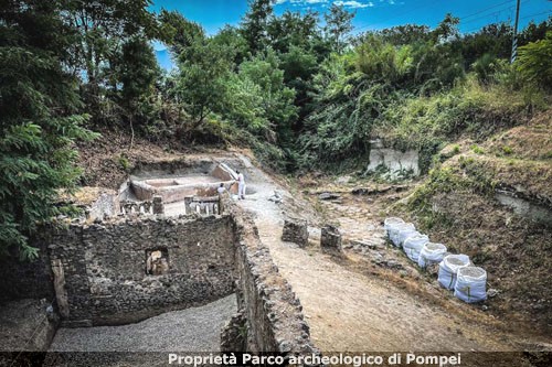 Des travaux d'excavation effectués dans la Nécropole de la Porte Herculanum à Pompéi, ont permis de découvrir un tombeau archaïque correspondant à la période Samnite, donc période antérieure à la colonie romaine de la ville. La richesse de ces fouilles rend cette découverte très importante. La poursuite de ces travaux, ont enrichis ce motif, car de nouveaux éléments ont été découverts dans cette zone, une sépulture sous la forme d'une grande Caisson, en pierre calcaire du fleuve Sarnum, datée du IVe siècle environ avant JC. Ces nouvelles découvertes ont été étudiées et l'on a retrouvé les restes ossements d’un homme avec tout autour des riches offrandes, composé de 6 vases noirs. ?Cette découverte renforce encore plus l'idée que cette nécropole existait dans les temps préromains.