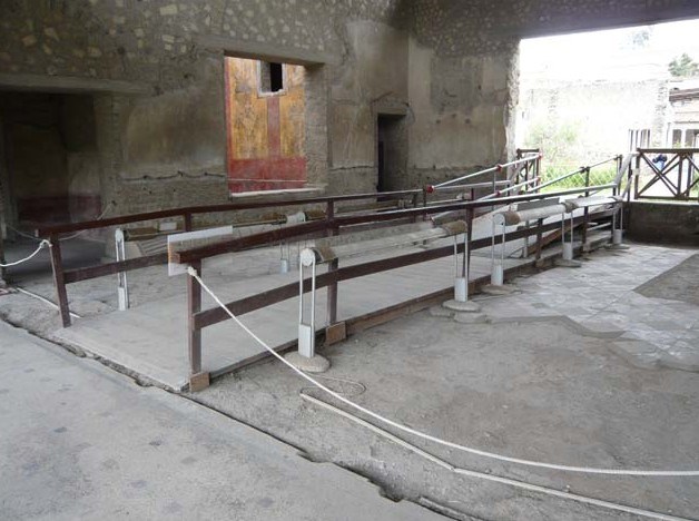 Il s'agit là du principal lieu de liaison entre la partie résidentielle de l'édifice, la plus ancienne, et la partie la plus récente essentiellement destinée au soin du corps, c'est-à-dire à la zone de la piscine ; sur les parois de ce couloir, extrêmement large et long, deux rangées de bancs, probablement utilisés pour s'installer en attendant d'accéder à la piscine ou pour se reposer. Le plafond est divisé en différents secteurs carrés par des poutrages ; ces carrés sont décorés avec de grands panneaux appartenant au IVe style*, caractérisés par des divisions géométriques concentriques reliées par des guirlandes et par d'autres éléments végétaux, enrichis de détails, des animaux, des carrés, des têtes de Méduse*, avec grande finesse et élégance. Outre les panneaux centraux on retrouve le revêtement en peinture également sur les poutrages et les hautes fenêtres s'ouvrant sur le péristyle 10.