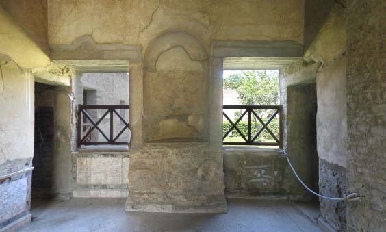 Dans cette petite chambre, les lits étaient disposés sur les côtés est et nord, dans des espaces spécifiques en forme de niche, surmontés d'une voûte ; plus tard, un lieu de passage fut aménagé dans la paroi du fond. Les moulages de la porte et particulièrement ceux de la fenêtre, à demi ouverte au moment de l'éruption, sont très intéressants. Les fresques appartenant au IIe style* ressemblent beaucoup à celles de l'atrium 5: la décoration est ici aussi réalisée avec des structures architecturales en trompe-l'oeil, mais moins imposantes et dans des proportions plus réduites, adaptées à la taille des lieux. Dans les niches, les voûtes encadrées par des corniches en stuc étaient décorées avec un motif à caissons; des scènes de paysages ornaient les lunettes.