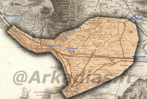Au nom de cela, Pompéi avait la "Juridiction Administrative sur tout son territoire, qui était assez vaste: il allait des limites occidentales d'Herculanum, passant par les pentes du Vésuve , la zone nord puis Boscoreale, se dirigeant ensuite plus au nord vers Sarnum et Nuceria, puis descendant vers Stabiae sur la côte. En observant une carte actuelle, on note qu'en raison de sa position, Pompéi contrôlait toute la plaine à l'est du Vésuve jusqu'à la mer ; dans cette géographie particulière, se retrouvait Oplontis. C'était donc une zone suburbaine pompéienne, composé principalement de villas de loisirs de riches vacanciers romains, mais aussi de grandes villas rustiques, insérées dans une zone territoriale à prédominance agricole où l'exploitation de l'agriculture était le premier objectif. Cette zone autour de Pompéi était donc composée de Villas Riches d' Ozium et Villas Rustiques de travail. Les fouilles agricoles effectuées sur cette région particulière d'Oplontis n'ont jamais démontré avec certitude la présence ou l'existence de un centre résidentiel tel Cité classique, au de la des riches Villas dont nous avons preuve aujourd'hui. Des fouilles ont été effectuées dans la région, et deux Villas y ont été mises a jour, dont la plus vaste, aurait appartenu à Poppée, seconde épouse de l'Empereur Néron. Il est très difficile de dire avec certitude à qui appartenait cette villa. Ce qui est certain, est que les propriétaires, étaient très riches et que c'était pour eux une "résidence secondaire". La découverte d'une amphore portant l'inscription "Secundo Poppaea", c'est a dire envoyée à Secundo, affranchi de Poppée, a étayé l'hypothèse selon laquelle la Villa aurait appartenu à la "gents Poppeae".